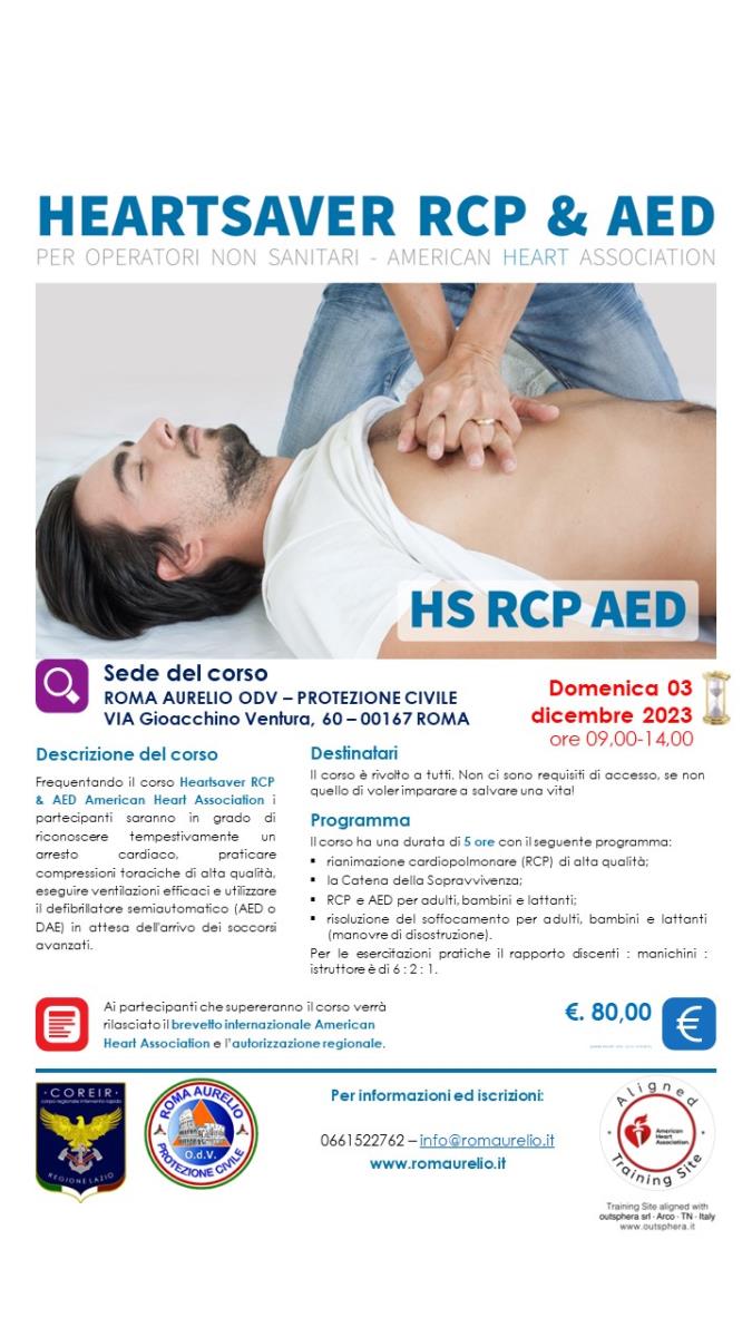 03 dicembre 2023 - Corso rianimazione cardio polmonare con l’uso del defibrillatore, domenica 03 dicembre 2023 - 09.00-14.00 - il team della formazione di Roma Aurelio, lavora incessantemente per preparare sempre più persone ad intervenire in caso di arresto cardiaco improvviso, perché la tempestività ad agire nei primi minuti dall'accaduto può salvare una vita. Aperte le iscrizioni. Per informazioni: info@romaurelio.it tel. 0661522762